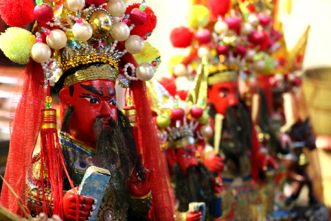 海口武圣庙大堂摆放的关公,专供民众正月上街巡游时抬着拥着(朱正明摄影)