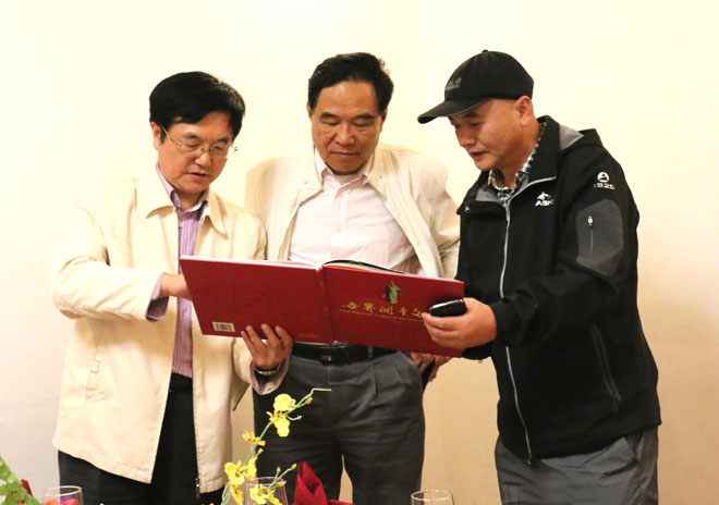 右起:海南著名文化学者刚峰、海南省乡土文化专业研究会主任蒙乐生、关公文化学者朱正明在一起(戴如江摄影)