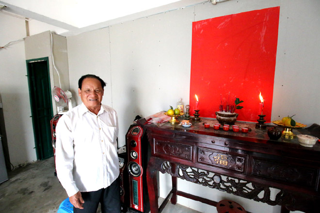 三亚海棠区铁炉村董文利家中,正堂摆放着供桌,正墙贴一张大红纸,代表各路先贤(朱正明摄影)