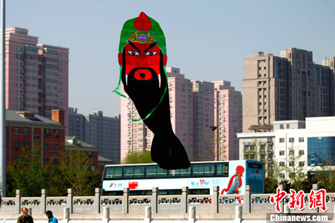 据众多媒体报道:4月4日,一个关公造型的风筝翱翔在北京上空。