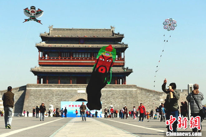 当天,北京东城区清明节风筝放飞活动在永定门广场举行,来自东城区风筝协会的会员及风筝爱好者将100多只造型各异的风筝放飞天空。(中新社发 富田摄)