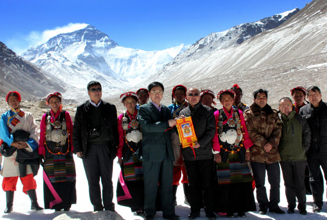 在珠穆朗玛峰大本营,朱正明先生向定日县长王珅赠送关帝唐卡