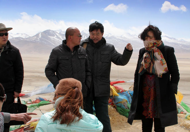 越野车上,坐着湖北省委统战部海外中心主任朱正明,沈阳德源集团董事长崔玉晶,北京中建建筑设计院沈阳分院院长洪常锁,沈阳新型建筑材料制造有限公司总经理李春福,画家、雕刻家、中建沈阳分公司艺术总监张雪松,西藏定日县委常委、宣传部长何贤江等。