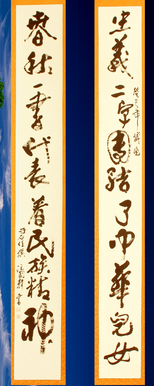 此前几天,朱正明刚刚邀请全国政协委员、著名书画家汪国新先生为洛杉矶关帝庙题写了大门楹联: