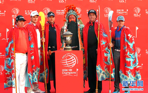五位高尔夫巨星--美国公开赛冠军贾斯汀-罗斯,英国公开赛冠军米克尔森,美国PGA锦标赛冠军詹森-杜夫纳,前高尔夫世界第一麦克罗伊以及世锦赛-汇丰冠军赛卫冕冠军保尔特从“中国战胜”关公的手中一一接过兵刃之后,先是跟着京剧演员舞动兵刃,然后摆出各种造型供记者们拍照。