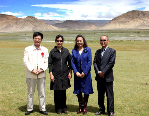 左起:湖北省委统战部海外中心主任朱正明、日喀则地委宣传部长欧珠卓玛(日喀则地委重建珠穆朗玛关帝庙领导小组组长)、沈阳德源集团董事长崔玉晶、定日县县长王珅(定日县重建珠穆朗玛关帝庙领导小组组长)