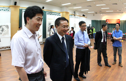 中联办文教部部长助理李正桥(前右)、中联办协调部处长朱大国(前左)参观展览