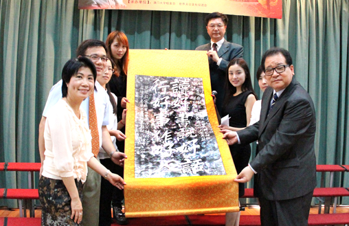 湖北省委统战部海外中心主任朱正明向澳门大学校友会赠送当阳关陵“关帝垂训古碑”拓片