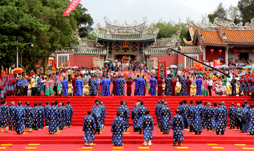 自古以来,台湾各行各业几乎都崇拜关公。在拥有2300余万人口的台湾,关公信徒多达800万众。在台湾许多家庭乃至商家企业,常可看到厅堂正中的“头条”位置都是让关帝像、关帝联给占据着。过年过节以及农历五月十三关帝诞辰,台湾信众都要隆重备办牲礼,虔诚地在关帝像前顶礼膜拜,借此机会祈求关帝“关护”家庭、事业、前途、健康等等。台湾这种奇特的关帝文化信俗与香缘祖庙所在地东山岛百姓自古共奉关帝为祖,“户户皆挂关帝像,家家都是关帝庙”的信俗奇观一脉相承。两地民众有共同方言、文化传统、习惯心理以及共同的宗教信仰、思维方式和价值取向,组成了一个文化共同体