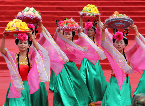 东山岛姑娘在关公文化节为关老爷敬献寿桃