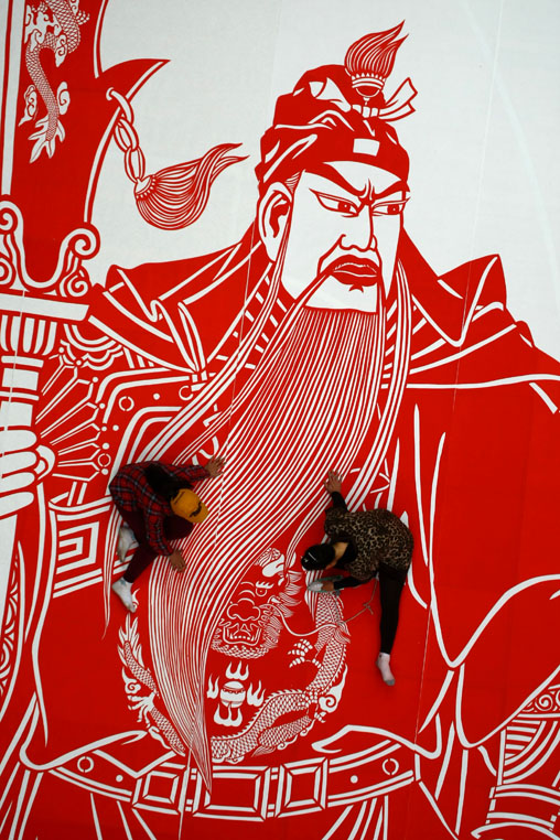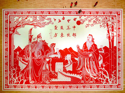 高晓东介绍,《中华双圣图》共用白纸1200张,红宣纸600张,裱画背纸500米,裱画用布650米等,花费5万余元。高晓东说,“我现在准备申报世界最大的剪纸吉尼斯世界纪录!”