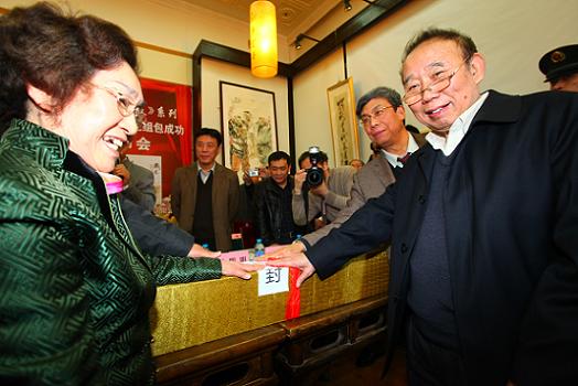 故宫博物院研究员 文化部艺术品评估委员会委员许丽(左一)、故宫博物院书画组组长潘增亮(右一)为汪国新艺术品《朋友》系列---中国首个诗书画资产包封包贴封