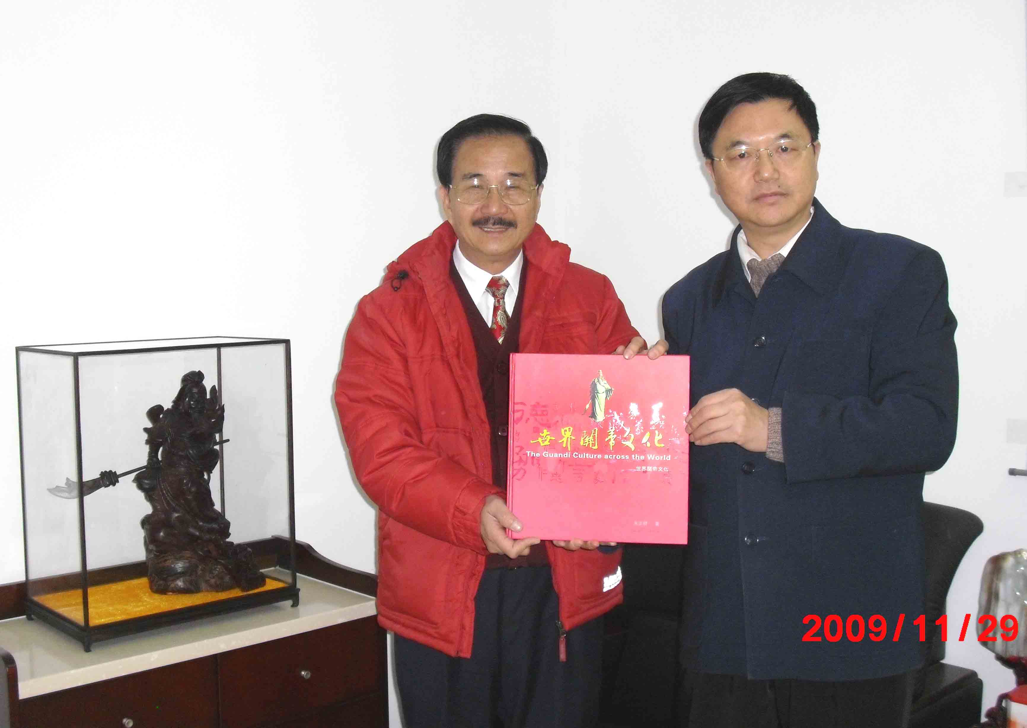 周庆峻先生有意在湖北竖起一尊数十米高的关帝圣像,并建设配套设施,征求朱正明先生的意见和建议。朱正明向周会长介绍了世界关帝文化的发展、世界关帝圣像的各自特点、促进台海两岸关帝文化交流等。