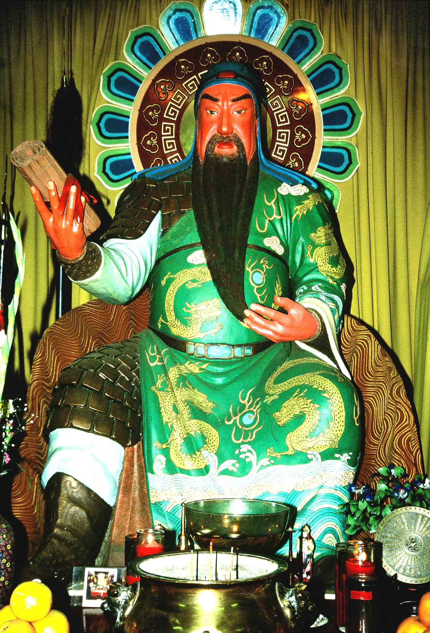 1994年早春二月,大西洋岸边的纽约曼哈顿关帝庙,举行了隆重的“关帝圣像开光盛典”。高五点九英尺的关公,端坐于神龛之中,“义节千秋”金匾高悬神龛之上,两侧彩灯闪耀,关公身着绿色龙袍,手持《春秋》,好一幅古色古香且具浓郁中华民族特色的关帝文化图。