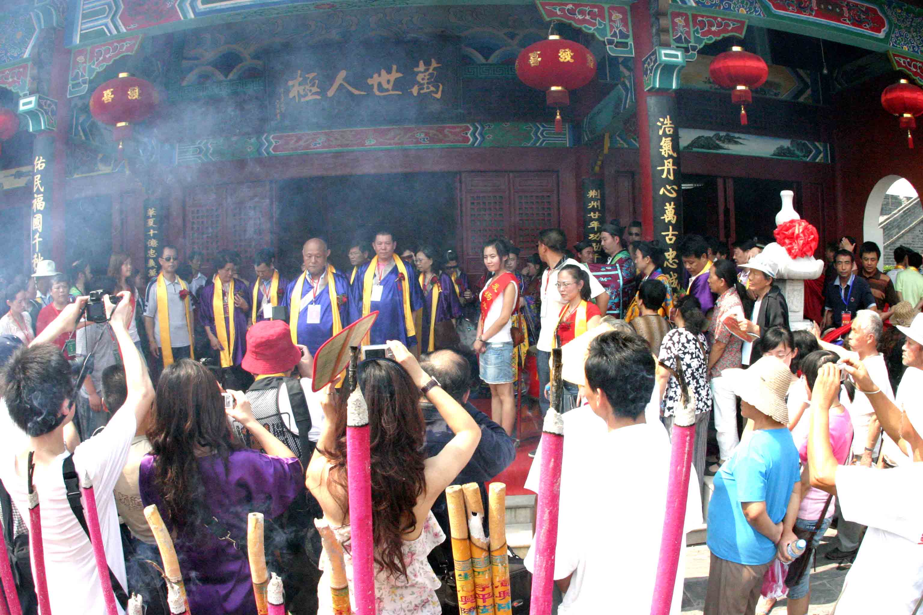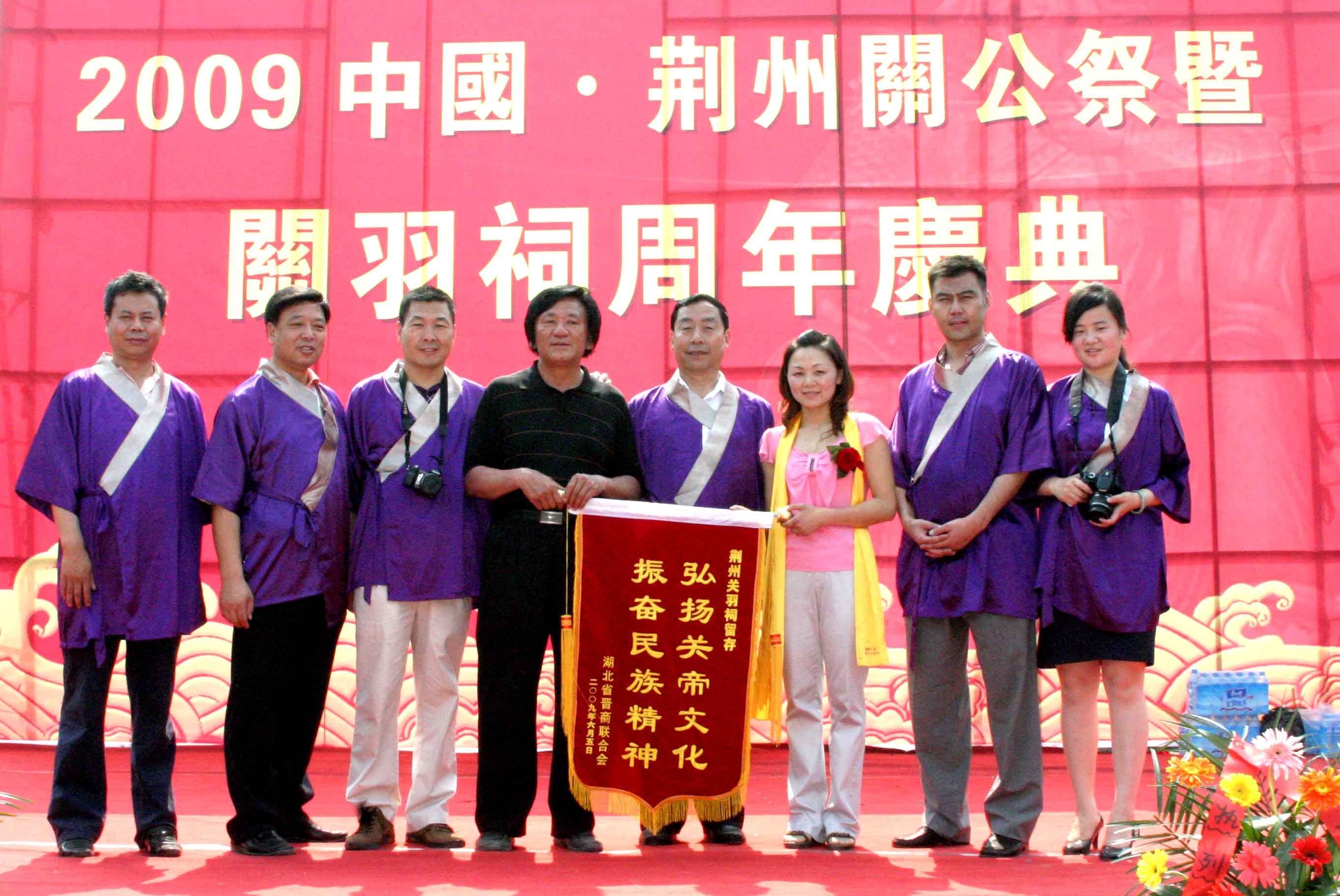 关羽祠董事长刘于东(右五)、总经理刘燕(右三)接受湖北省晋商联合会赠送的锦旗“弘扬关帝文化,振奋民族精神”