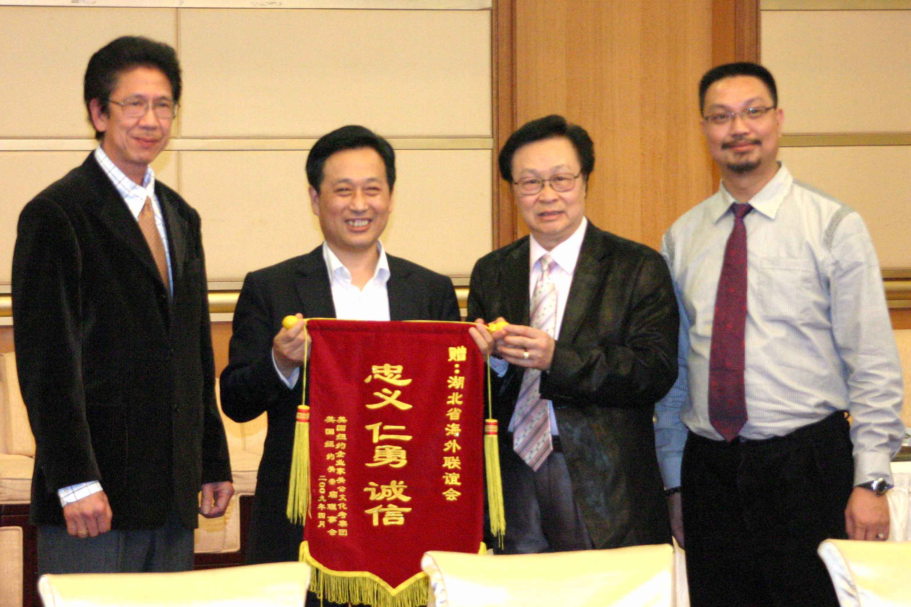 纽约利口福饮食公司董事长梅贤添(右二)、纽约B.T.建筑工程公司董事长梁伟燮(右)、美国飞达健康食品公司副总裁陈宏策(左)向湖北省海外联谊会副会长汪梦军赠送锦旗(朱正明摄影)