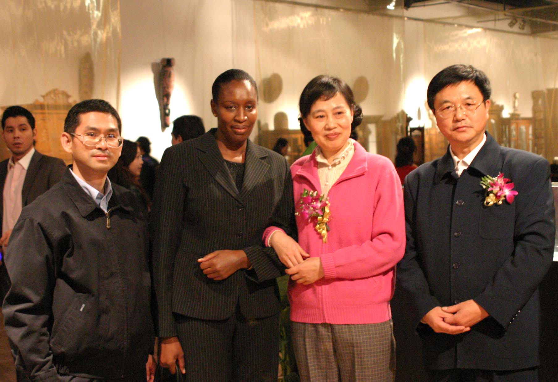 肯尼亚驻中国大使索利泰女士(左二)、中非民间商会副秘书长张丽(右二)、培训部部长郭凯勇(左一)、、湖北省非洲民间商会秘书长朱正明(右)在展览现场(申文政 摄影)