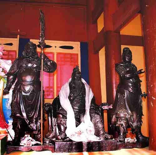 世界关公文化促进会、北京关公文化传播有限公司共同赠送给拉萨关帝庙的关公、关平、周仓铜铸像,已经供奉在拉萨关帝庙正殿(朱正明 摄影)