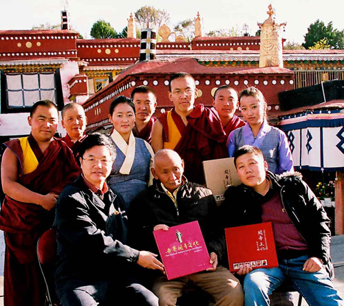 世界关公文化促进会秘书长朱正明(前排左)、吉林省关帝文化传播有限公司董事长冯绍杰(前排右)向拉萨关帝庙主持益西强巴赠送《世界关帝文化》大型画册(傅家骥 摄影)