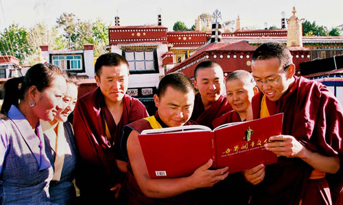 拉萨关帝庙喇嘛和西藏大学学生传看《世界关帝文化》专著(朱正明 摄影)
