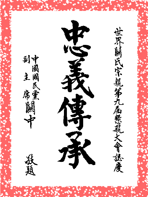 世界关氏宗亲第九届恳亲大会前夕,组委会收到50多份热情洋溢的题词、贺词。中国国民党主席吴伯雄先生的题词是“敦亲睦族”;中国国民党副主席关中先生的题词是“忠义传承”;世界关氏宗亲总会主席关泰和先生的贺词是“精诚团结,祖德流芳”;世界关公文化促进会、世界关公文化网的贺词是“弘扬世界关公文化,振奋中华民族精神”。