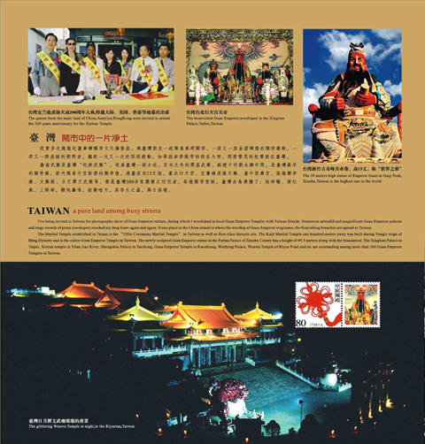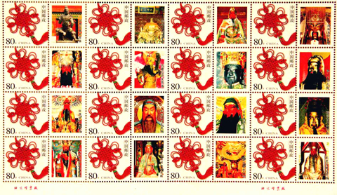 中国首次印制的关帝像个性化邮票,精选了中国大陆、台港澳、日本、韩国、新加坡、美国、毛里求斯等11个国家和地区关帝庙供奉的16尊关帝圣像。为了更好地保存关公像邮票并提升其文化品位,香港世界关公文化促进会为邮票精心制作了大型豪华邮册,展现了每张邮票所在地的风土民情,图文并茂,中英文对照,前全国政协副主席赵朴初题字,仅印制1200册,十分珍贵。