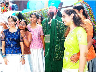 午后的太阳火辣辣,披着厚重戏服的潘禅脸上不停的冒汗,不过每当有人过来同他合影,他都正襟“威立”,捋捋长须,作关公状。只见一群印度姑娘围过来,潘禅道:“你们知道我是谁吗?我是关公!”姑娘们笑而不答,大方地攀住“关公”的臂膀,对着相机镜头尽显妩媚。
