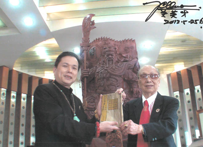 爱国侨领关英才先生向黄喜得主席授关帝玉玺等