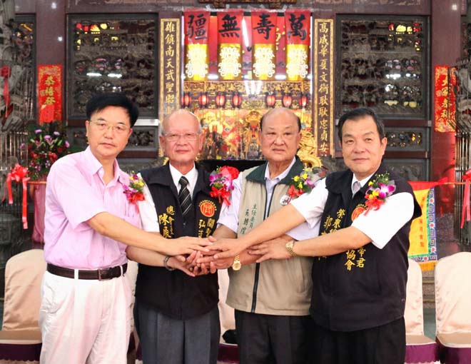 图:台湾中华关圣帝君弘道协会三任总会长吴朝煌(右二)、郭有智(右一)、陈展松(右三)与大陆文化学者朱正明紧紧握手
