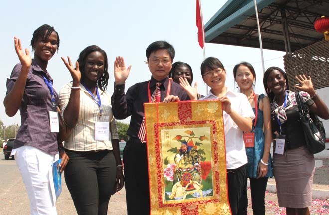 图:朱正明在非洲加纳向当地学生赠送关公唐卡,推广关帝文化。