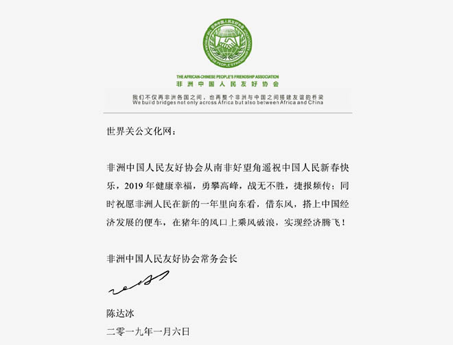 我谨代表湖北非洲商会,向世界关公文化网致以深深的谢意,感谢你们对关公文化的传承与宣扬,祝朋友们新春愉快,万事顺意!