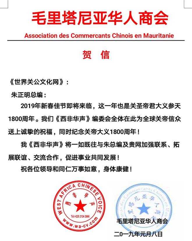 值此新春佳节,纪念关公大义参天1800周年之际,谨代表法国留尼旺华商会,向全球华人致以节日的祝福,祝愿关帝忠义精神凝聚海外华人情结,引导海外华人前行的路!