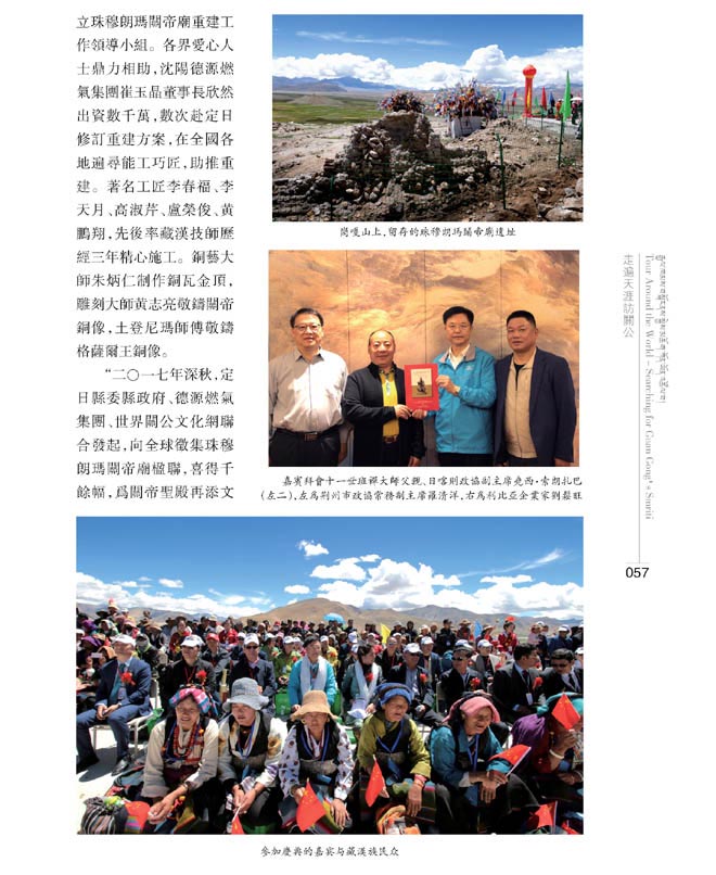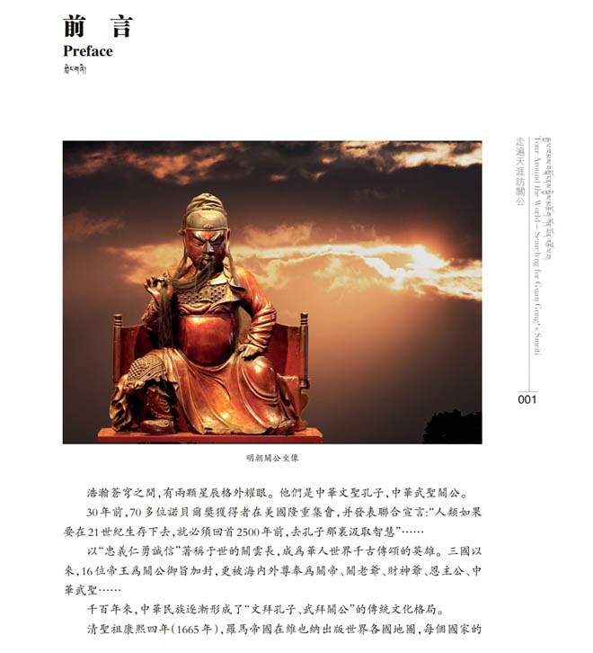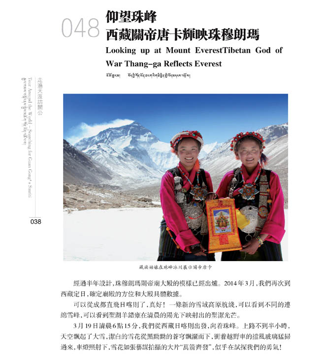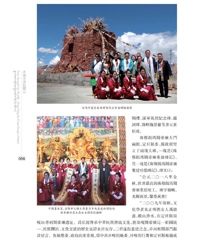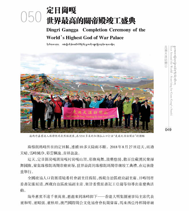 这本关帝文化专著,由胡德平先生题写汉文书名,十一世班禅大师题写藏文书名,将在2018年12月25日印制完成。书中讲述了中国摄影家朱正明15次进入西藏,寻访雪域高原关帝文化的精彩故事;讲述了企业家崔玉晶在珠峰下重建世界最高的关帝金殿的故事;讲述了海内外嘉宾在珠峰下庆祝珠穆朗玛关帝殿竣工的故事;讲述了中央统战部、全国政协、西藏自治区领导关注、推动藏汉文化交融的故事;讲述了藏族姑娘白玛卓玛在阿里雪山冈仁波齐托举起关帝圣像的故事…… 还有摄影家朱正明100多幅珍贵图片。