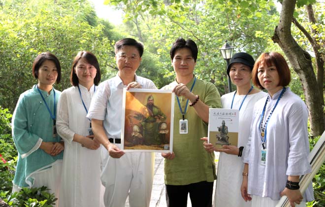 摄影家朱正明向关公同心会赠送关公油画(作者苏英毅),右起:陈浚绮、余京蔓、杨富翔、朱正明、束杭遥、方煊萁
