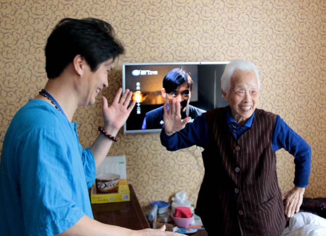 在养老山庄,杨富翔会长与一位89岁的婆婆谈得老高兴了,婆婆从卧床上站起来,与杨会长跳起了交谊舞。这一幕,让随行的义工们深深感动。