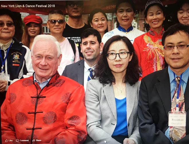 右起:纽约灵应关帝庙主席李绍基、中国驻纽约总领馆侨务组领事董海荣、美国纽约参议员高顿观看龙狮表演