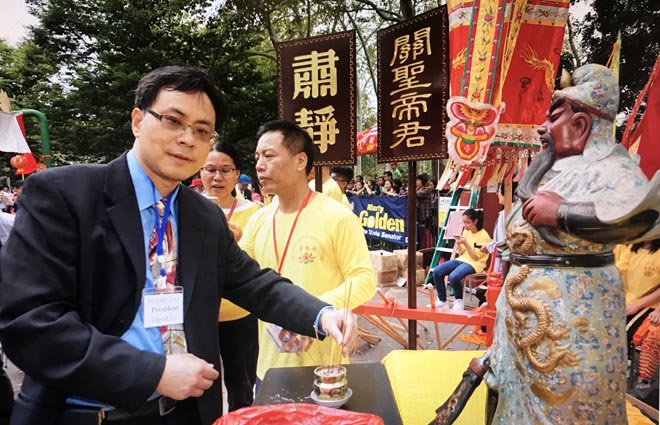 纽约灵应关帝庙主席李绍基在龙狮节现场为关公敬香