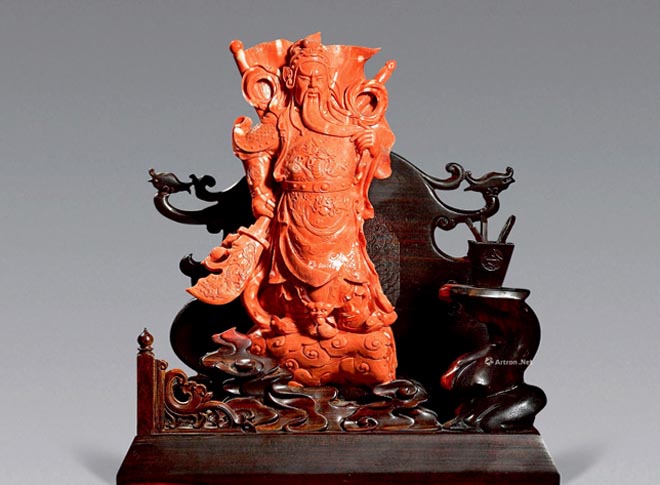 6 ◎ 珊瑚关公摆件 高25cm,重1062g,2017年11月北京中恒信拍卖,成交322万元人民币。