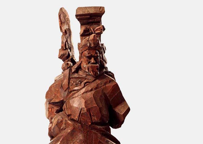 7 ◎ 台湾朱铭大师木雕关公 1990年作,76×24×23cm,亚洲私人收藏。2016年10月香港苏富比拍卖,成交137万人民币。台北汉雅轩画廊收藏,作者朱铭亲签作品证书。