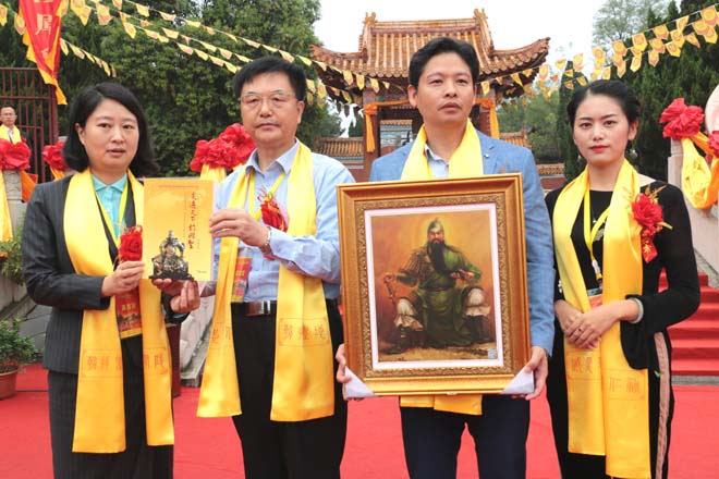 欢迎仪式上,朱正明向当阳市委常委、宣传部长李敏赠送《走遍天下访关公》专著,将关公获奖油画(作者苏英毅)赠送给宜昌市关公文化研究会秘书长关洪波