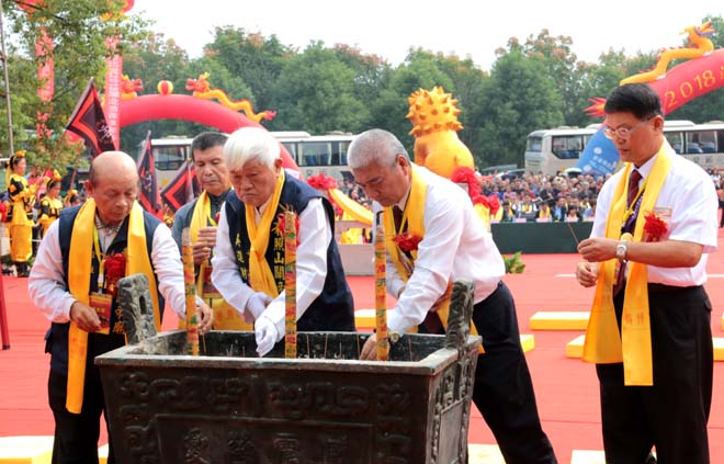 台湾东照山关帝庙吴进财主委、吴贵荣堂主、台湾中华传统宗教总会代表陈振帆、张清川、台湾中华关圣文化世界弘扬协会黄国彰理事长祭拜关公