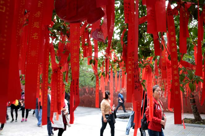 关陵大殿后院树枝上,挂满祈愿彩条