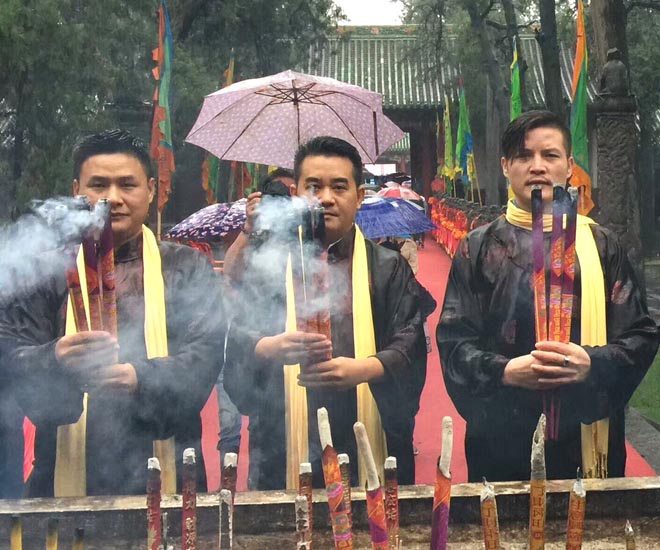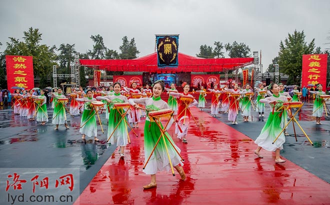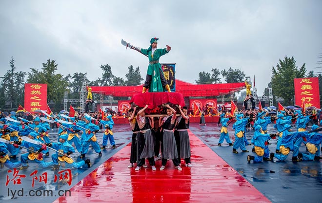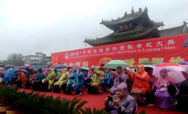 这天上午,恰逢连绵秋雨,来自中国大陆、台湾及东南亚的嘉宾,仍兴致勃勃地穿起雨衣,打着雨伞,汇聚关林广场,观看千年关公信俗表演,祭拜中华武圣关公。