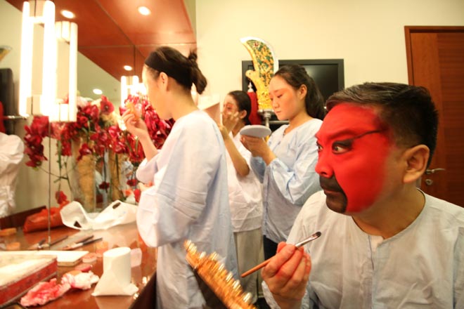 武凌云在香港首届关公节表演前,自己画关公妆