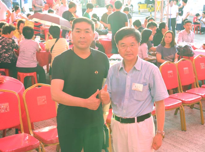 武凌云(左)与文化学者朱正明在香港元朗千人盆菜宴