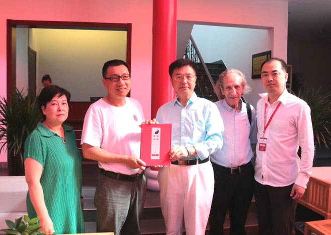 中国人民大学哲学院何建明博士(左二)向摄影家朱正明(中)赠送新著《关帝藏》。右一为中国企业文化促进会创新发展文化专业委员会秘书长王银城,右二为法国远东学院及中国人民大学道教研究中心研究员范华Patrice Fava,左一为国际洪门慈善总会荣誉总会长黄瑞蓉女士