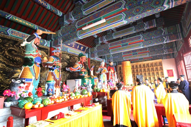 北京怀柔雁栖湖畔,怀柔关公庙道长们为嘉宾表演祭拜仪式