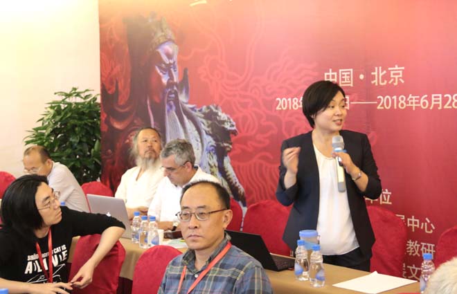 中国人民大学文学院副教授吴真(右一)演讲《明清“关公斩妖”主题戏曲的仪式展演》,右二为云南大学历史与档案学院教授郭武