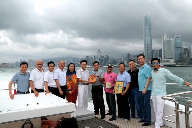 在维多利亚港湾游轮,大陆代表团向香港山西商会会长胡晓明、澳门山西商会副会长陈炎平赠送水晶关公像