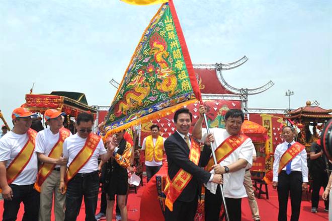 山西解州关帝庙卫龙所长将祈福令旗传递给金门县长陈福海(李金生摄影)